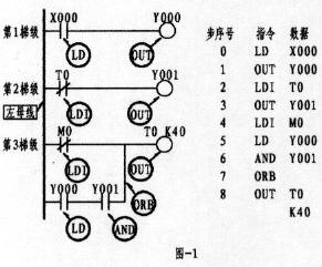 第3梯級;左邊第一個觸點為常閉,上標為M0, M為輔助繼電器(該繼電器有多種,注意類別),其指令的正確表示應(yīng)為:4、LDI M0(如程序所示)。本梯級的第2行第一個觸點為常開,上標為Y000,Y表示輸出繼電器,由于該觸點與后面Y001觸點呈串聯(lián)關(guān)系,形成了所謂的電路"塊",故而其觸點的指令應(yīng)為 5、LD Y000。總之LD與LDI指令從上面可以看出,它們均是左母線每一梯級第一觸點所使用的指令。而梯級中的支路(即第3梯級的第2行)有二個或二個以上觸點呈串聯(lián)關(guān)系,其第一觸點同樣按LD或LDI指令。可使用LD、LDI指令的元件有:輸入繼電器X、輸出繼電器Y、輔助繼電器M、定時器T、計數(shù)器C、狀態(tài)繼電器S。OUT為線圈驅(qū)動指令,該指令不能出現(xiàn)在左母線第一位。驅(qū)動線圈與驅(qū)動線圈不能串聯(lián),但可并聯(lián)。同一驅(qū)動線圈只能出現(xiàn)一次,并安排在每一梯級的最后一位。如上圖中的1、OUT Y000,3、OUT Y001,Y為輸出繼電器,其線圈一旦接獲輸出信號,可以這樣認為,線圈將驅(qū)動其相應(yīng)的觸點而接通外部負載(外部負載多為接觸器、中間繼電器等)。而上圖8、OUT T0 K40 為定時器驅(qū)動線圈指令,其中的K為常數(shù)40為設(shè)定值(類似電工對時間繼電器的整定)。可使用OUT指令元件有:輸出繼電器Y、輔助繼電器M、定時器T、計數(shù)器C、狀態(tài)繼電器S。