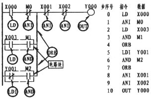 由上圖可以看出,第一支路X003的常開觸點與M1的常開觸點成串聯(lián)關(guān)系(在這樣的情況下,形成了塊的關(guān)系),它是與上一行的X000與M0串聯(lián)后相并聯(lián),此時程序的編寫,如步序號0、1、2、3、4所示。4所出現(xiàn)的第一個ORB指的是與上一行并。而第二支路,常閉Y001與M2同樣是串聯(lián)關(guān)系。也是一個塊結(jié)構(gòu),其串聯(lián)后再與第一支路并。故步序7再次出現(xiàn)ORB。ORB指令并無梯形圖與數(shù)據(jù)的顯示。可以這樣認為;它是下一行形成電路塊的情況下與上一行并聯(lián)的一條垂直直線(如圖中所示的二條粗線)。