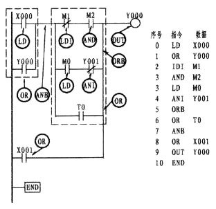 可以看出上圖的X000、X001、M0三者處于并聯(lián)關(guān)系。由于X000下面二條支路均為單個觸點,因X001是常開觸點,故用OR指令。而M0是常閉觸點,則用ORI指令。三接點并聯(lián)后又與M1串聯(lián),串聯(lián)后又與Y000并聯(lián),而Y000也是單個觸點,所以仍采用OR指令。可使用OR、ORI指令元件有:輸入繼電器X、輸出繼電器Y、輔助繼電器M、定時器T、計數(shù)器C、狀態(tài)繼電器S。