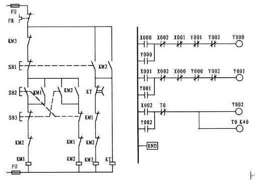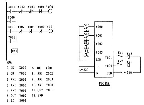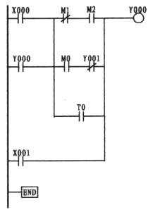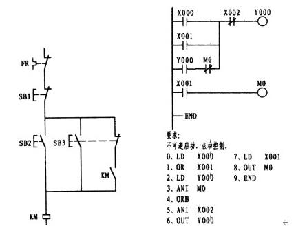 這一道題往往是初學(xué)者邁不過的一道坎。這主要是因為繼電器電原理圖使用的是復(fù)合按鈕,形成的思維定式所造成。從梯形圖中可以看出,X001為點動控制觸點,因左邊的電原理圖是使用的復(fù)合按鈕,思維上自然而然轉(zhuǎn)向了采用X001的常閉觸點,與X001的常開形成了與復(fù)合按鈕相似的效果,想象是不錯。要知道PLC在運行狀態(tài)下,是以掃描的方式按順序逐句掃描處理的,掃描一條執(zhí)行一條,掃描的速度是極快的。如果是用X001的常閉代替M0的常閉的話,當按下外接點動按鈕時,X001常開觸點則閉合而常閉接點則斷開,但一旦松手其常閉觸點幾乎就閉合形成了自保,因此失去了點動的功能,變?yōu)橹挥袉拥墓δ堋L菪螆D中的第一梯級中的第二支路是由Y000的常開與中間繼電器M0的常閉相串后再與第一支路相并,在這樣觸點多的情況下如果允許應(yīng)將它擺列在第一行,這樣在編程時可以少用了ORB指令。