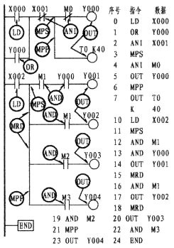 (6)進棧指令MPS、讀棧指令MRD、出棧指令MPP和程序結(jié)束指令END;MPS、MRD、MPP這是一組堆棧指令。如下圖使用的二種堆棧形式;在堆棧形式下MPS應(yīng)與MPP成對出現(xiàn)使用。如在第一堆棧形式下,則采用MPS、MPP指令。若在MPS、MPP指令中間還有支路出現(xiàn),則增加MRD指令,如下圖的第二堆棧所示。應(yīng)知道MPS、MPP成對出現(xiàn)的次數(shù)應(yīng)少于11次,而MRD的指令則可重復(fù)使用,但不得超過24次。要知道這一組指令,同樣并無梯形圖與數(shù)據(jù)的顯示。可以這樣認為;MPS是堆棧的起始點,它起到承上啟下的聯(lián)接點作用,而支路的MRD、MPP則與之依次聯(lián)接而已。而END指令則是結(jié)束指令,它在每一程序的結(jié)束的末端出現(xiàn)。