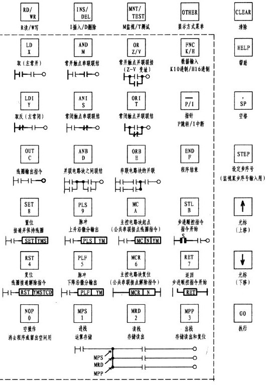 ⑨指令鍵/元件符號鍵/數(shù)字鍵(虛線框內(nèi)):這些鍵均可自動切換,上部為指令鍵,下部為元件符號鍵或數(shù)字鍵。一旦按了指令鍵,其它鍵即切換成元件符號或數(shù)字,可以進行選擇輸入。其它Z/V、K/H、P/I均可同一鍵的情況下相互切換。
