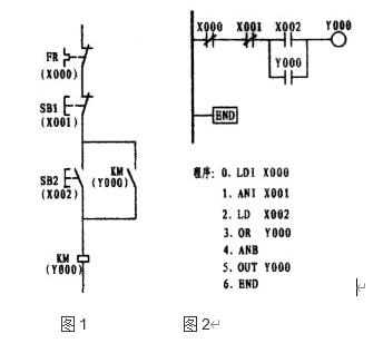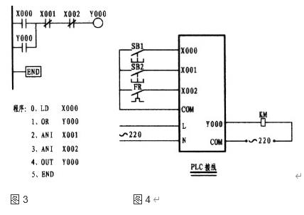 工作原理:以圖3為例說明,當外接啟動按鈕一按,X000的常開接點立即閉合電流(實為能流),流經(jīng)X001、X002的常閉接點至使輸出繼電器Y000閉合,由于Y000的閉合,并接于母線側(cè)的Y000常開觸點閉合形成自保,由輸出繼電器接通外部接觸器,從而控制了電動機的運行。停止時按外部停止按鈕,X001常閉接點在瞬間斷流從而關(guān)斷了輸出繼電器線圈,外部接觸器停止運轉(zhuǎn)。當電動機過載時,外部熱繼電器常閉接點閉合,導(dǎo)至X002常閉接點斷開,從而保護電動機。