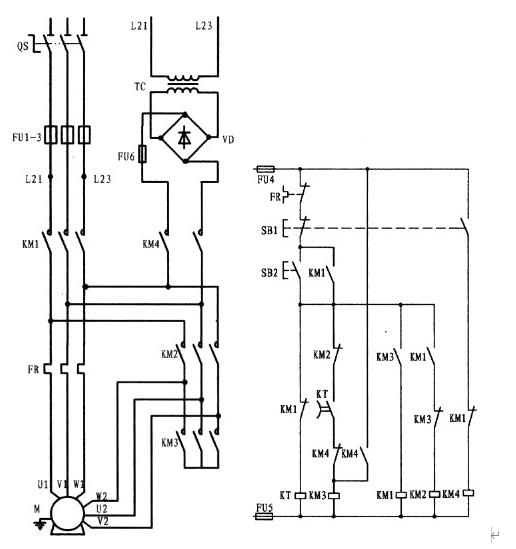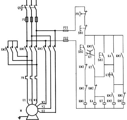 該線路控制的是一臺雙速電動機,一般的人對它不是很理解。電動機型號為YD123M-4/2,6.5/8KW,△/Y。根據(jù)型號解讀;該電機具有二種速度即4極和2極,在4極速度下,電動機的功率為6.5KW,繞組為三角形接法。如果在2極的速度下,電動機的功率為8KW,繞組為雙星接法。該電動機共有6接線頭,三角形接時(低速)電源由U1、V1、W1接入,其余接頭U2、V2、W2為懸空。星接時(高速)將接線頭U1、V1、W1接成星點形成了雙星點,三相電源則由U2、V2、W2輸入(電動機接線圖詳上圖所示)。該線路要求;電機可以在低速、高速狀態(tài)下?lián)衿湟贿\行。而在高速運行時則按低速啟動再轉(zhuǎn)為高速運行。自己可根據(jù)電原理圖進行分析。