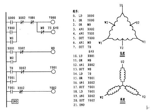 低速運行時,按外接啟動按鈕SB1,此時第二梯級接于母線一側(cè)的X001閉合,電流(能流)則通過串接于其后的X002接通中間繼電器M0線圈,使并接于母線一側(cè)的M0常開接點閉合,使M0中間繼電器線圈形成了自保。由于M0線圈的閉合,使第一梯級第二支路母線一側(cè)的M0常閉接點閉合,同時切斷了定時器線圈T0的運行,使電流接通了Y000輸出繼電器,外接的接觸器KM1接通使電動機處于三角形低速運行狀態(tài)。停止,則按外接按鈕SB1即可。這就是低速運行過程。注意:本梯形圖未設(shè)置熱保護,從原圖來看熱保就少用了一個。可在梯形圖第一梯級Y001常閉接點后串接X003,同時在第四梯級X002常閉接點后串接X004。