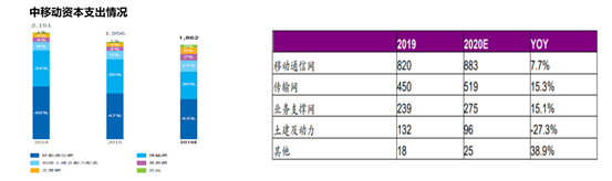 中國移動2020年資本開支計劃為人民幣1798億元,同比2019年資本支出大幅提高了8.38%;中國電信2020年計劃資本支出達850億,同比大幅提高9.6%;中國聯通2020年計劃資本支出達700億,同比大幅提高24.07%。可以從以上數據看出,隨著5G牌照的發放,中國的5G建設將會延續4G建設的周期和強度,在未來的3-5年內,以新基建中骨干力量的姿態,撐起中國經濟和中國電子信息行業的一面大旗。