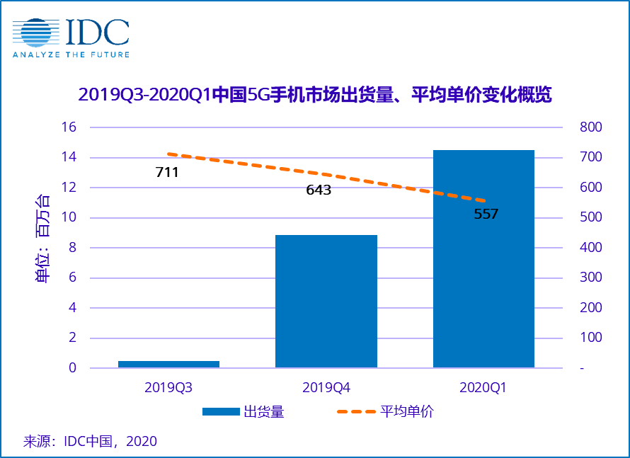 在IDC發(fā)布的手機(jī)季度跟蹤報(bào)告中顯示,2020年第一季度,國內(nèi)5G手機(jī)出貨量約1450萬臺,占整體市場21.8%,環(huán)比上季度增長64%。