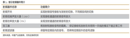 濾波、功放、高精度數模轉換等核心芯片,決定了基站能處理無線信號的頻段、無線信號中通信信號的處理能力和噪聲信號的抑制能力,基站的負荷能力等性能。射頻器件的具體功能介紹如下: